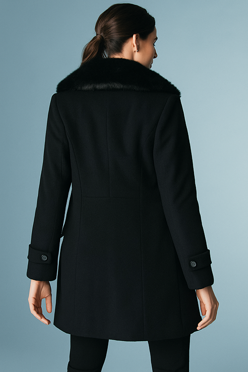 Abrigo largo negro de botones al frente y cuello desmontable.