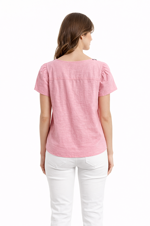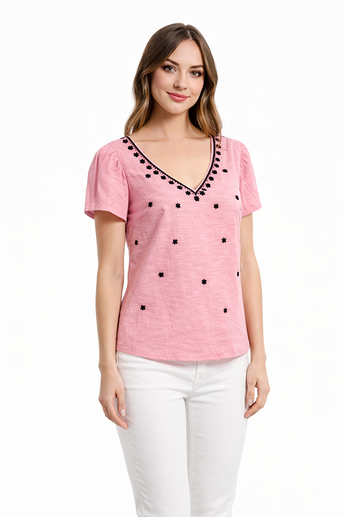 Blusa rosa ligera con escote en V y bordados negros. Corte recto y manga corta, perfecta para outfits casuales de temporada.