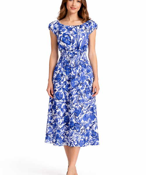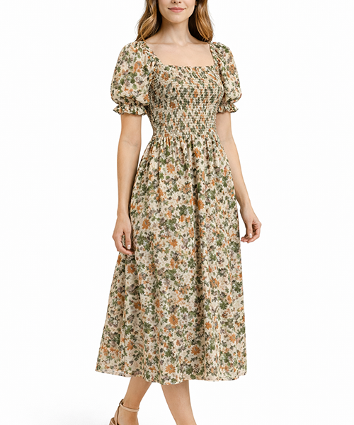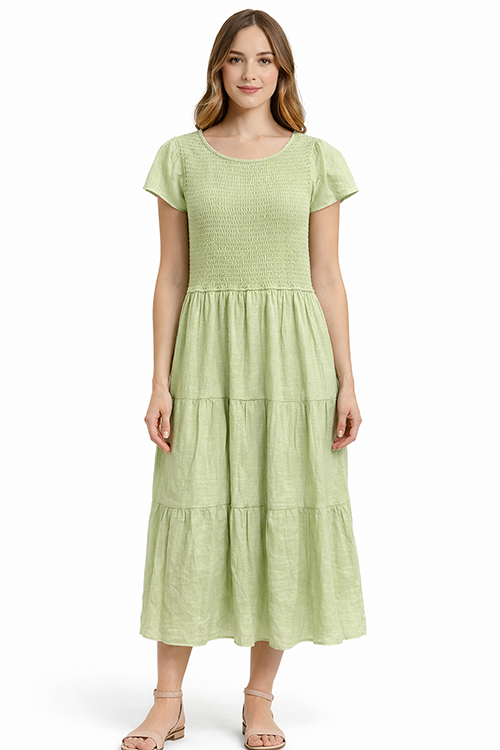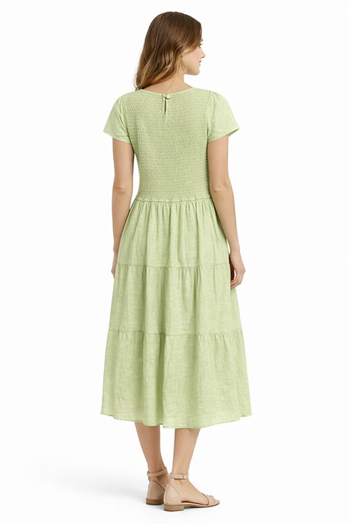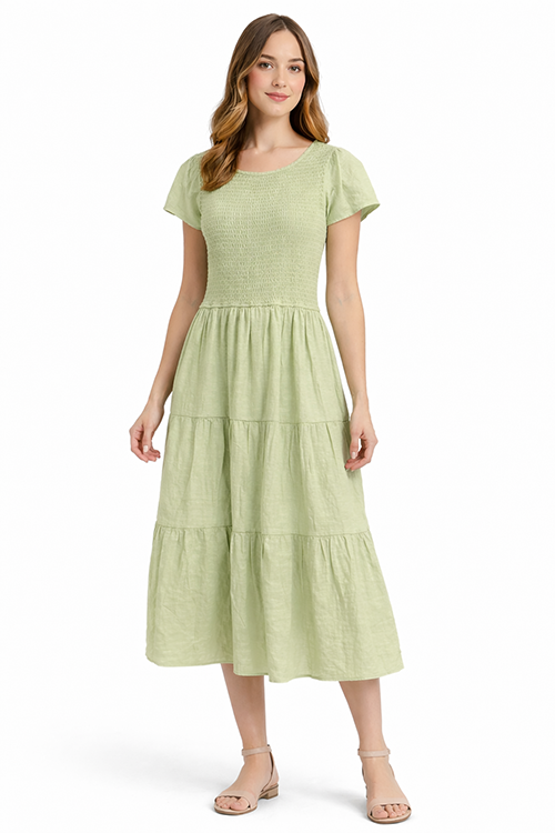 Vestido midi en tono verde menta con parte superior tipo smock elástico que se ajusta al cuerpo. Diseño de manga corta y falda con caída amplia en niveles, ideal para un look fresco y femenino de temporada.