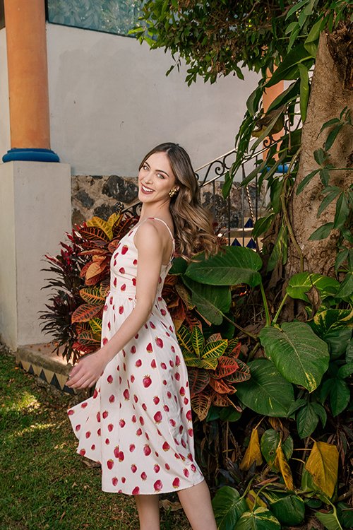 Vestido midi en tono claro con estampado de fresas, escote en V y tirantes delgados ajustables. Corte a la cintura con falda fluida que aporta movimiento y frescura, ideal para un look dulce y veraniego. SKU: 51015 $449 MXN